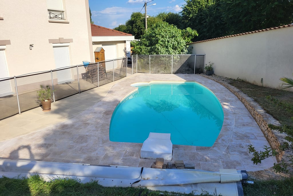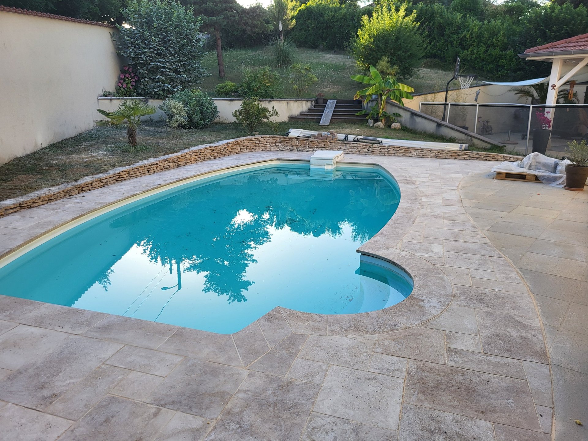 La nouvelle finition a été réalisée en dallage travertin multiformat, avec des dalles de 3 cm d’épaisseur, y compris les margelles de la piscine. Ce matériau naturel apporte un rendu élégant et authentique, tout en étant agréable au toucher pieds nus et parfaitement adapté aux zones humides.
