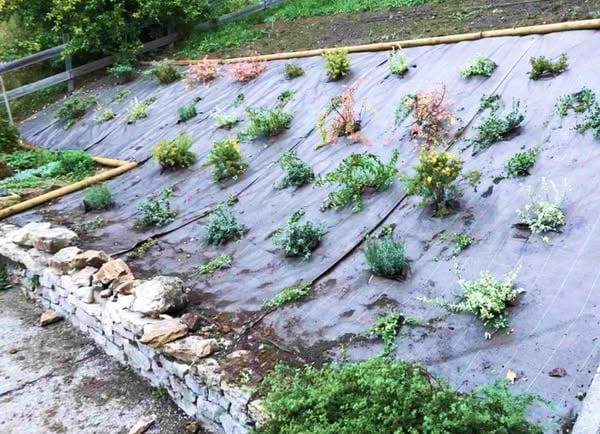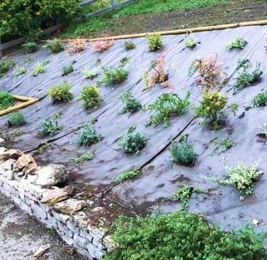 Nous avons installé une toile tissée marron maintenue par des rondins en pin pour un effet naturel, puis planté des végétaux rampants adaptés à la géographie de la maison. Un système d'arrosage par goutte-à-goutte a été mis en place pour optimiser l'arrosage des plantes.